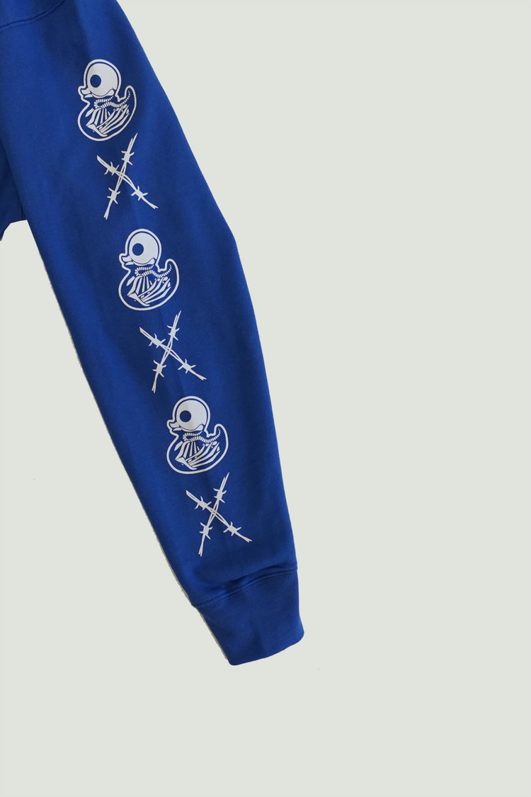 Show your support for the #fearfam in this hooded sweatshirt with the and-screen-printed Project Fear logo on the front and a sizeable x-ray duck on the back. This hoodie is 80% cotton and 20% polyester blend fleece with a jersey-lined hood, matching flat braided drawcords, and a pouch pocket, perfect for storing your ovilus, digital recorder, crucifix, and EMF detector. They are finished off with a red woven label on the hood.