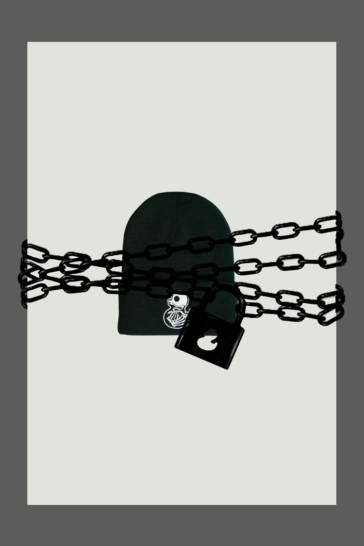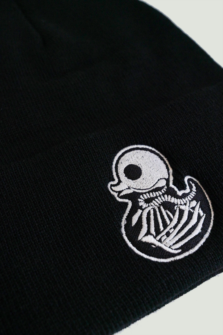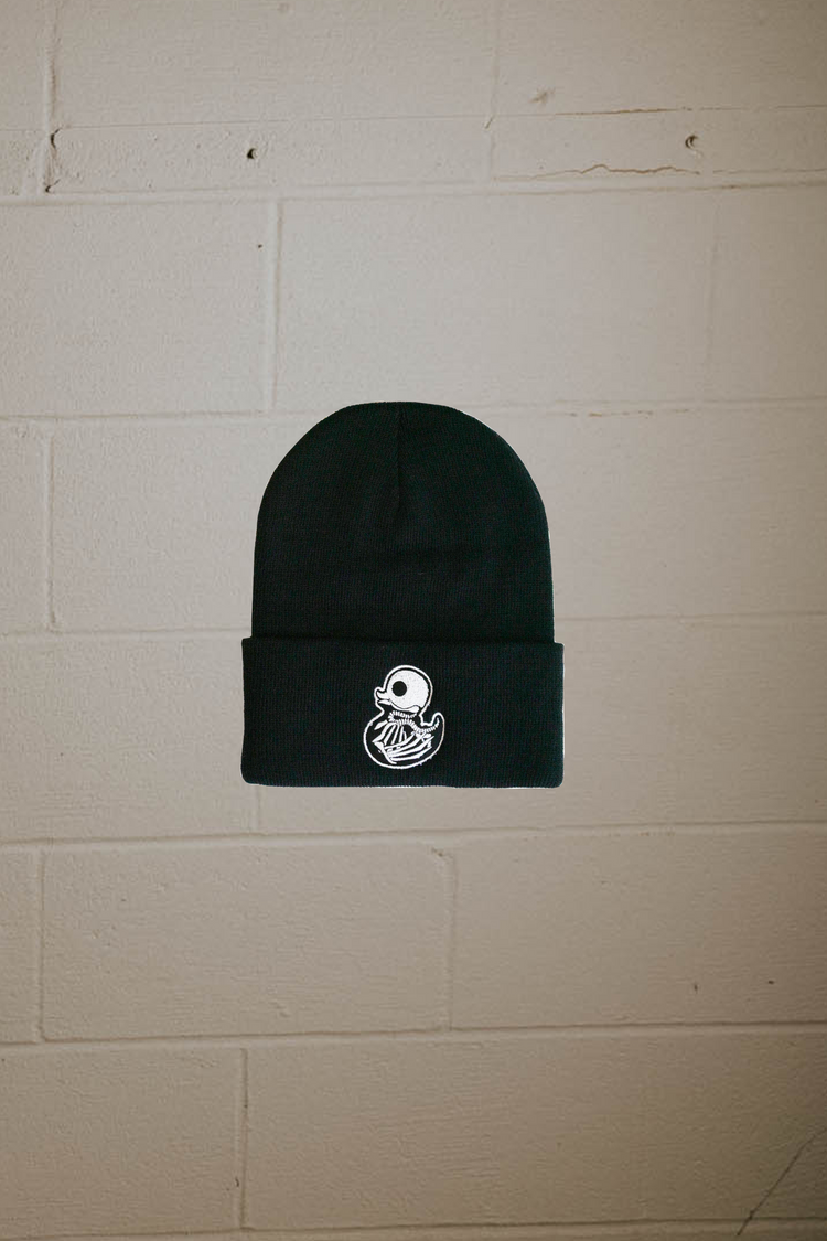 One size fits most on this black 100% acrylic and heather grey 62% acrylic and 38% polyester beanies. Featuring the Skelie Duckie logo embroidered in-house and made to order.